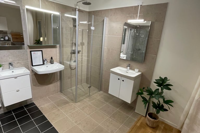 Ytskikt och Montering : Vi lägger nytt kakel, klinker eller annan yta, installerar tak/väggar och monterar all inredning (toalett, dusch, handfat, skåp).